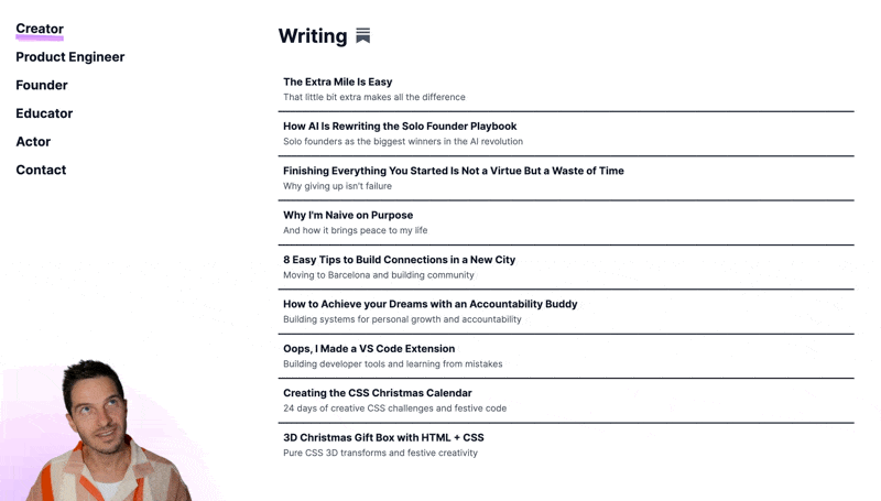 I added some effects on page transitions, the interactive glow behind the face in the bottom corner, and whimsical hover states for the blog posts.